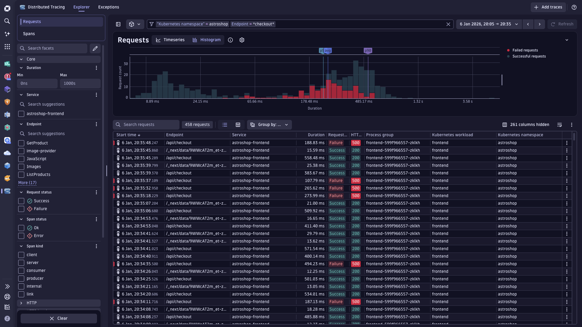 The Distributed Tracing app user-friendly interface is designed with engineers, SREs, and performance architects in mind, making it easy to visually analyze your trace data right away.