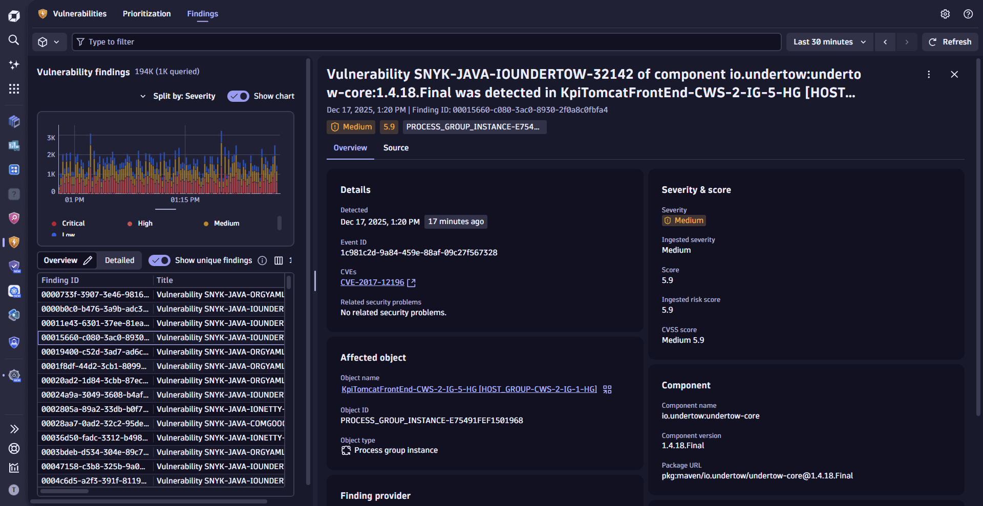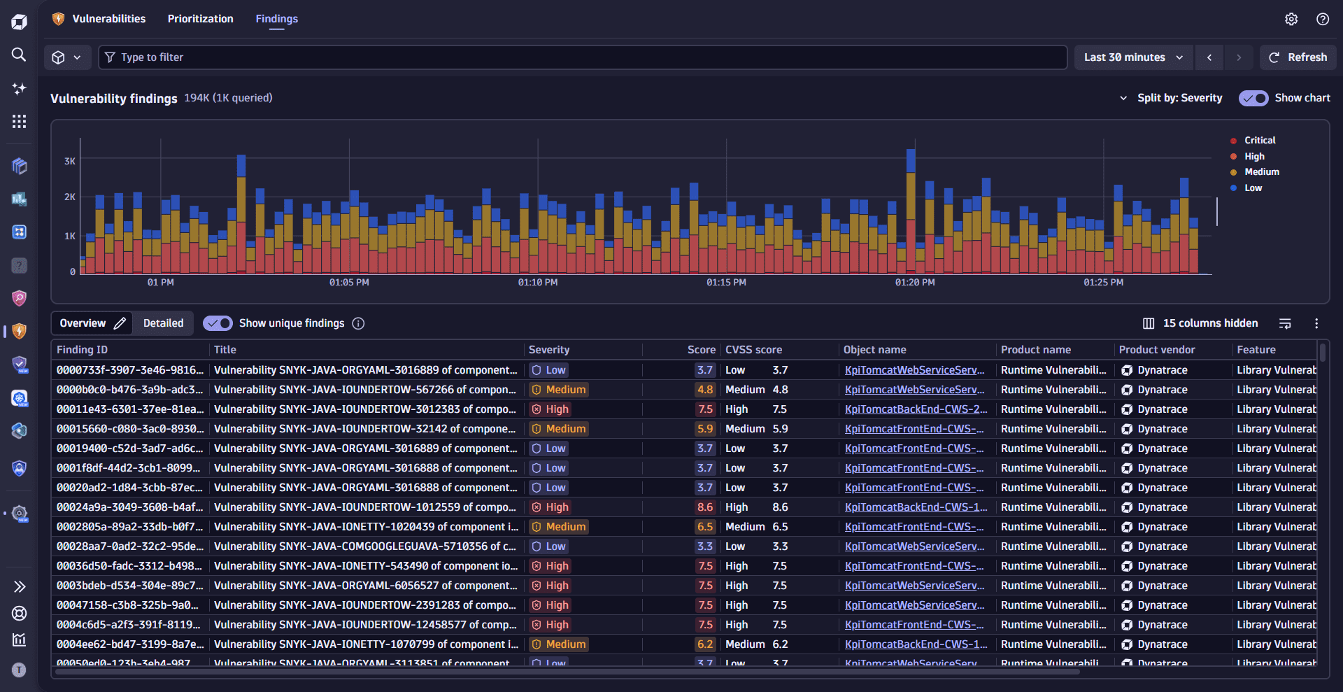 Vulnerabilities detects if the applications in your Dynatrace environment use vulnerable libraries at runtime or vulnerable runtime to execute your code. It helps you prioritize based on context and impact, efficiently addressing remediation actions.